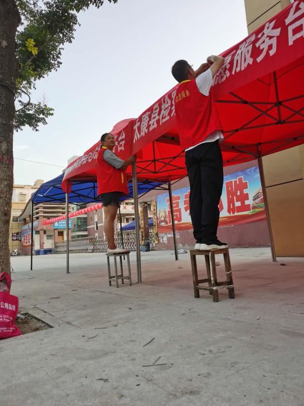 6日下午3時許,鄭雪艷和王作宇二人被安排到太康縣華夏外國語高考考點(diǎn)負(fù)責(zé)為考生和家長搭建11個茶水棚?!跋挛?點(diǎn)正是一天中最熱的時候,考點(diǎn)附近也沒有樹蔭?!碧悼h網(wǎng)信辦副主任高一麟回憶說,要在天黑之前搭建好11個茶水棚,對于鄭雪艷和王作宇兩人來說并非易事。