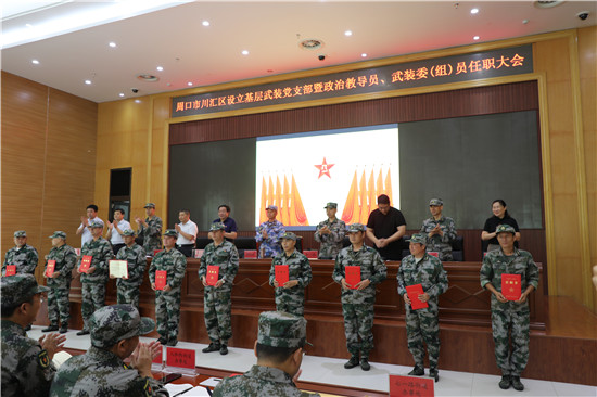 黨管武裝建設(shè)國防,軍民攜手共筑長城。為健全武裝工作組織領(lǐng)導(dǎo)體系為推動國防動員和后備力量建設(shè)在基層末端落實,7月16日上午,周口市川匯區(qū)召開基層武裝黨支部暨政治教導(dǎo)員、武裝委(組)員任職大會。周口軍分區(qū)司令員湯維政,區(qū)委書記、區(qū)人武部黨委第一書記李宗喜,市委組織部處級干部宋陽,區(qū)人武部政委高新傳、部長陳繼芳及城鄉(xiāng)一體化示示范區(qū)、經(jīng)濟開發(fā)區(qū)、港口物流產(chǎn)業(yè)聚集區(qū)等有關(guān)負責同志參加了大會。會上設(shè)立了18個基層武裝黨支部,任命了15名基層武裝部政治教導(dǎo)員、20名村(社區(qū))武裝委(組)員任職命令,武裝部政治教導(dǎo)員、武裝預(yù)建黨支部書記和兼職武裝委(組)員代表先后作了履職承諾發(fā)言,湯維政等為新任命的人員頒發(fā)了任職證書。