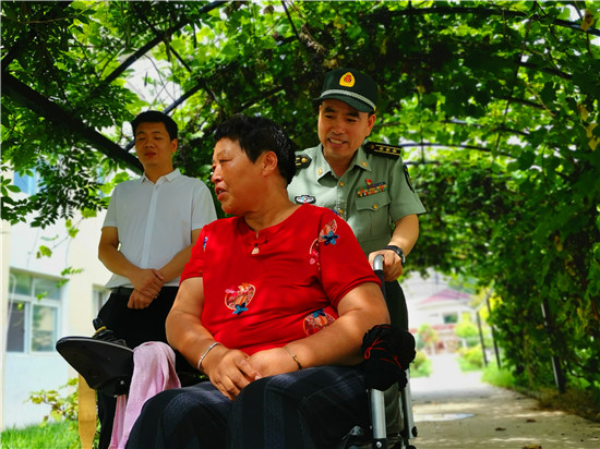 走進(jìn)位于太昊路上的周口市老年護(hù)理院,院內(nèi)整潔有序、花蕊吐香鳥鳴聲聲,小徑通幽處的涼亭內(nèi)三五老人打牌、聊天,一副愜意安詳?shù)纳顖?chǎng)景。在侯國(guó)領(lǐng)母親王玉勤居住的房間內(nèi),李揚(yáng)、孫光濤等人坐在床邊與她聊天談心,看到這么多人來慰問她,王玉勤眼中流下了感動(dòng)的眼淚,她對(duì)慰問人員表示感謝,說自己來護(hù)理院近一年來,吃住條件都不錯(cuò),護(hù)理院照顧的無微不至,身體一天天恢復(fù),閑暇時(shí)還能不依賴輪椅自己走上一段路。她激動(dòng)地說:“感謝黨和政府的親切關(guān)懷,我最大的愿望是希望倆兒子永遠(yuǎn)聽黨的話,在部隊(duì)安心服役、再立新功,用優(yōu)異的成績(jī)回報(bào)黨和政府對(duì)我們?nèi)业年P(guān)愛?!?/p>