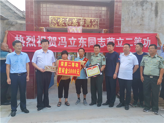 8月1日,淮陽區(qū)人武部負(fù)責(zé)人李保祥與該區(qū)退役軍人事務(wù)局局長董天祥等人一起,帶著二等功喜報及慰問金,專程趕往該區(qū)四通鎮(zhèn)葉莊行政村前馮橋村現(xiàn)役軍人馮立東家中。此時,村里鑼鼓隊(duì)敲響了,村民走出家門紛紛前來觀看,頓時贏得村民的一片喝彩及點(diǎn)贊聲。許多村民說:“孩子在部隊(duì)立功授獎,作為軍屬可真是光榮呀!”(記者孫安平 通訊員 張然 張航碩 攝影報道)
