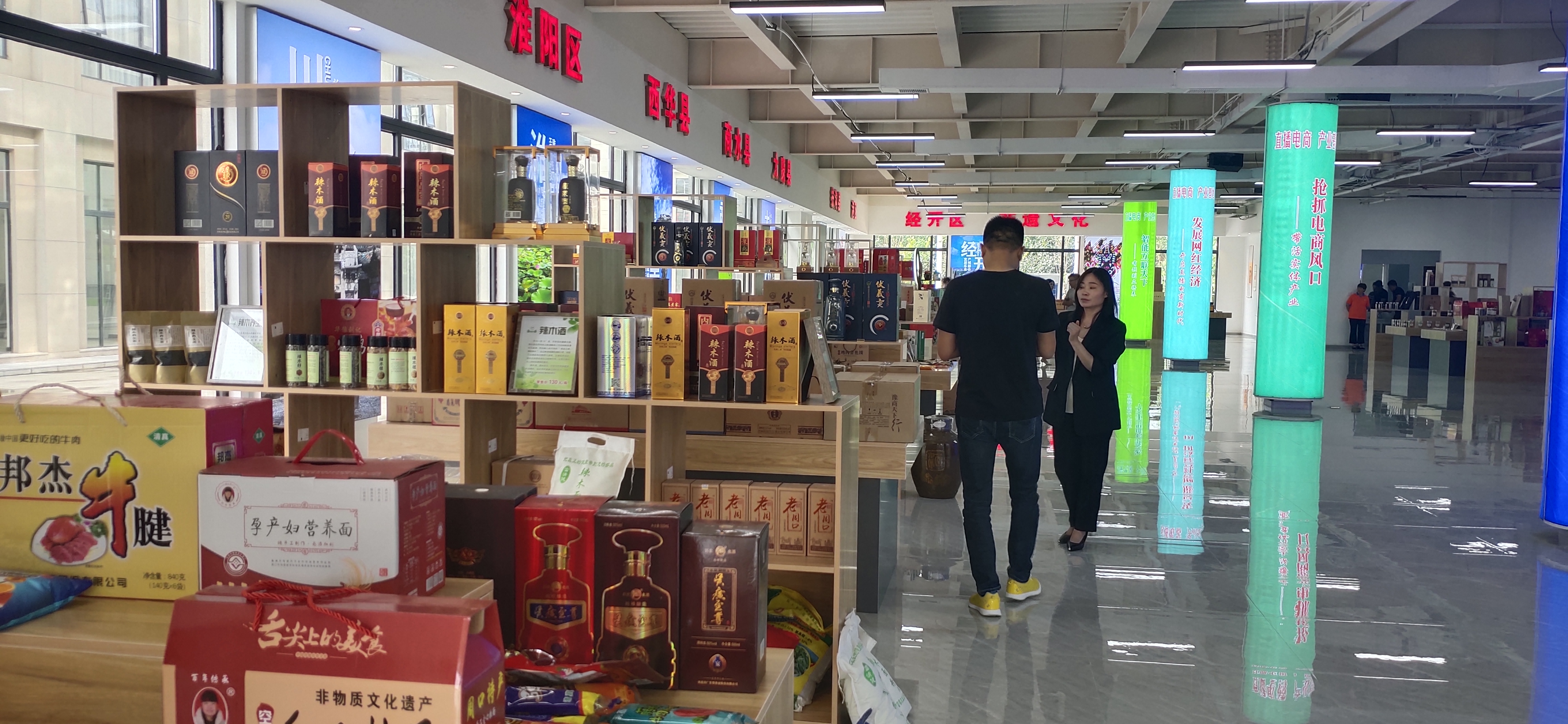 中心展廳面積達(dá)1000多平方米,按照不同縣(市、區(qū))劃分為十幾個區(qū)域,集中展示邦杰牛肉、伏羲貢酒、鄧城豬蹄、汝陽劉毛筆、三川豫龍復(fù)合肥等周口產(chǎn)品。這些產(chǎn)品都是來自各縣(市、區(qū))等地農(nóng)工副土特產(chǎn)品以及非遺產(chǎn)品?!拔覀儗⑼ㄟ^抖音、快手等視頻平臺,把這些產(chǎn)品銷往全國各地?!?該基地負(fù)責(zé)人、周口東方會展商會會長于海崗說。