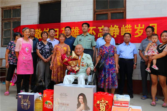 于永前一行來到楊廟鄉(xiāng)大祁行政村時已近中午,正趕上97歲抗日老戰(zhàn)士吳之太過生日。吳之太老少一家人歡聚一堂,其樂融融。看到慰問組的到來,老人喜極而泣。吳之太老人擦著眼淚說:這些年沒少給黨和政府找麻煩,尤其是縣退役軍人事務(wù)局成立后,幫助他解決了好多困難和問題,并定期來看望他,今天又見到大家,真不知道該說什么好。潘布道代表退役軍人事務(wù)局向老人祝賀生日并告訴老人說:抗戰(zhàn)老戰(zhàn)士是民族的英雄、國家的財富,為黨的革命和建設(shè)作出了不可磨滅的貢獻(xiàn)。今后,將一如既往地關(guān)心和幫助抗戰(zhàn)老戰(zhàn)士,盡力幫助解決生活中的實際問題,在全社會形成尊重抗戰(zhàn)老戰(zhàn)士、尊崇抗戰(zhàn)老戰(zhàn)士、關(guān)愛抗戰(zhàn)老戰(zhàn)士的良好氛圍。