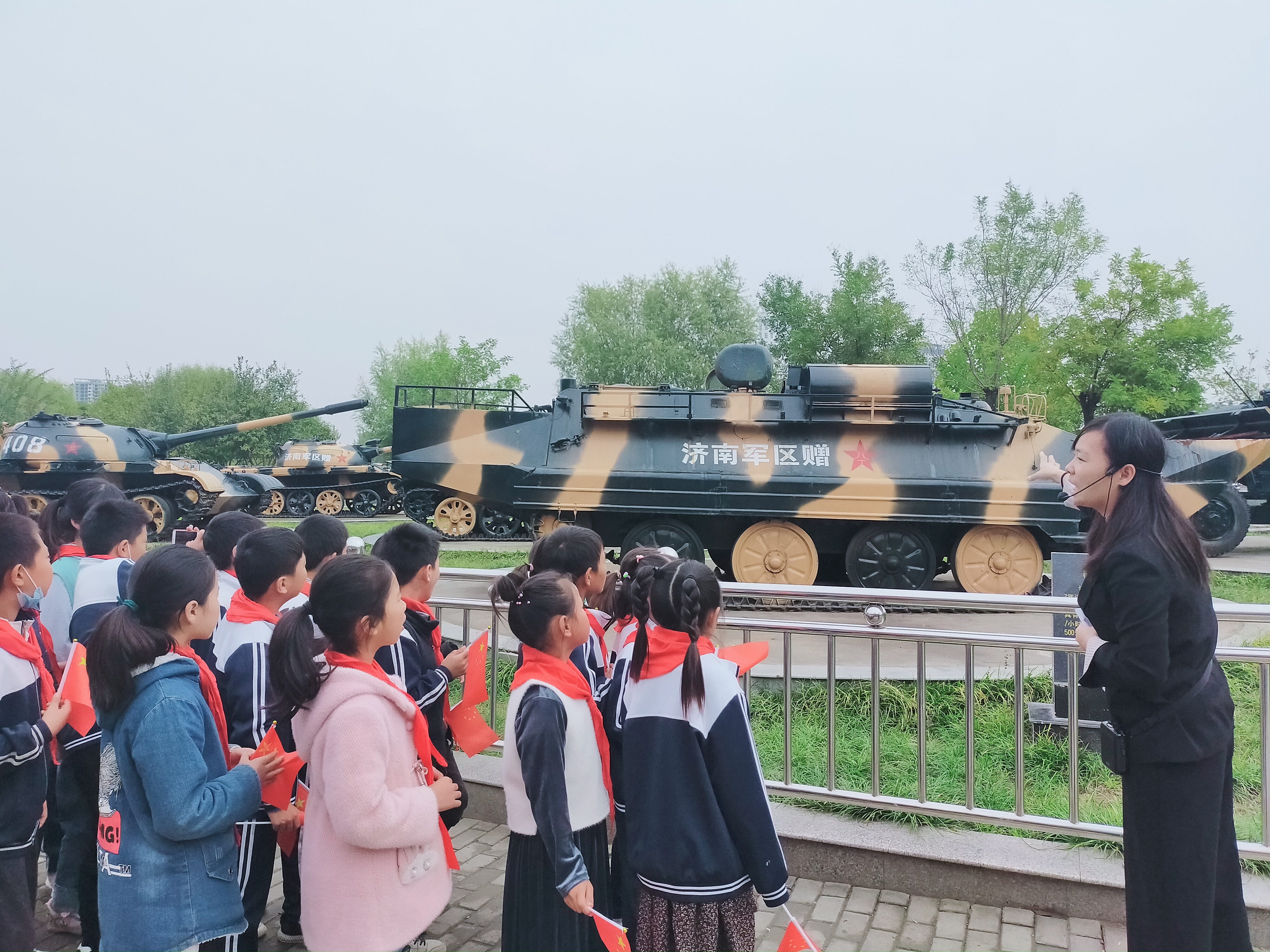 當(dāng)日10時許,在講解員的帶領(lǐng)下,學(xué)生們在周口國防園參觀了坦克、火箭炮、榴彈炮、高射炮、飛機等軍事裝備,增長了國防知識,受到了愛國主義教育。隨后,在主辦方志愿者的帶領(lǐng)下,學(xué)生們在軍艦旁齊唱國歌共同慶祝祖國生日。