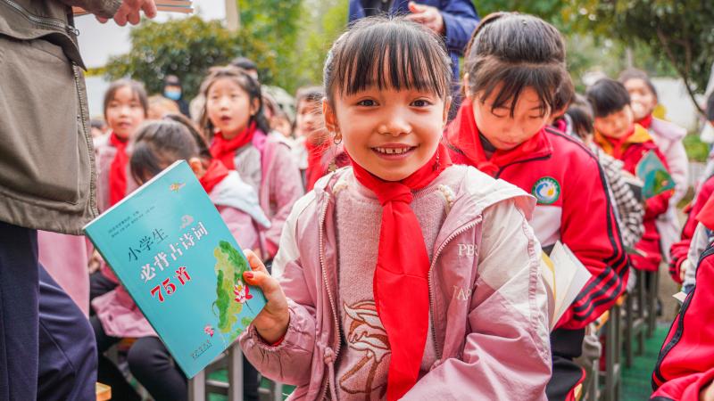 在看到擺在面前的幾百本書籍時(shí),孩子們的眼睛更亮了。散發(fā)著油墨清香的一本本新書遞到了孩子們手中,有經(jīng)典名著、古文詩詞,還有寓言故事、科普傳記等等。興奮地翻閱著手中的書籍,孩子們不由自主地念出聲來:“繁星閃爍著,深藍(lán)的太空,何曾聽得見他們對語,沉默中,微光里,他們深深的互相頌贊了……”優(yōu)美的詩句撫慰著孩子們的心靈,滋養(yǎng)著他們的精神世界。