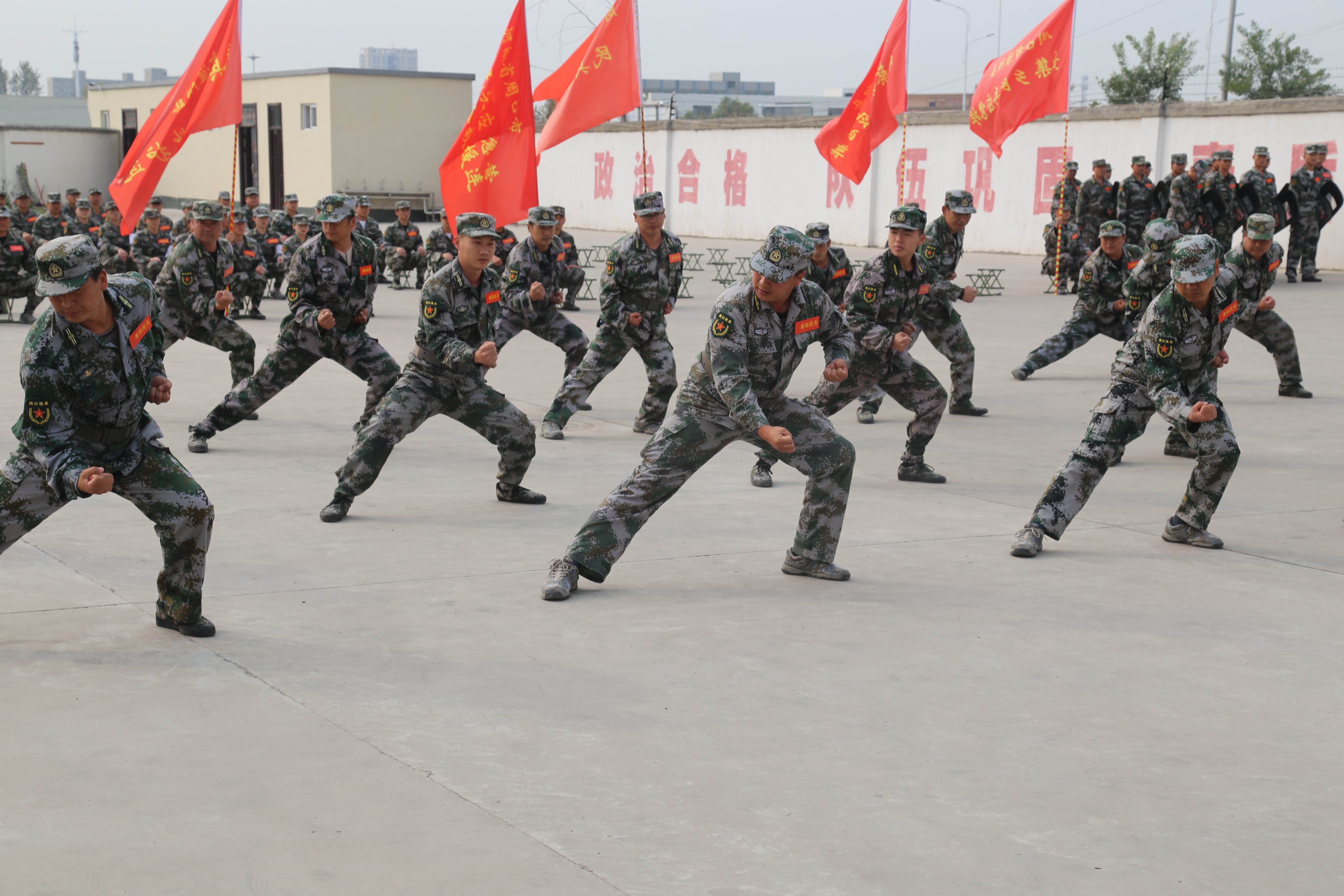成果匯報(bào)現(xiàn)場,殺聲震天,紅旗招展。軍體拳、警棍盾牌操、戰(zhàn)場救護(hù)、摔擒訓(xùn)練、單個(gè)軍人隊(duì)列動(dòng)作、防爆隊(duì)形、隊(duì)形運(yùn)動(dòng)等訓(xùn)練項(xiàng)目一一上演,每位民兵的一舉一動(dòng)、一招一式,都展現(xiàn)了基干民兵“聽黨指揮、能打勝仗、作風(fēng)優(yōu)良”的強(qiáng)軍目標(biāo),展現(xiàn)了大家召之即來、來之能戰(zhàn)、戰(zhàn)之必勝的優(yōu)良作風(fēng),受到了軍地領(lǐng)導(dǎo)的一致好評。