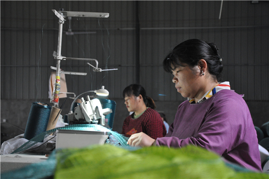 商水縣練集鎮(zhèn)按照“一鎮(zhèn)一主業(yè)”要求,在中楊莊村設(shè)立鎮(zhèn)工業(yè)園區(qū),在各村設(shè)立扶貧車間,大力發(fā)展?jié)O網(wǎng)編織業(yè),全力打造河南省最大的漁網(wǎng)小鎮(zhèn)。圖為村民正在扶貧車間加工漁網(wǎng)。