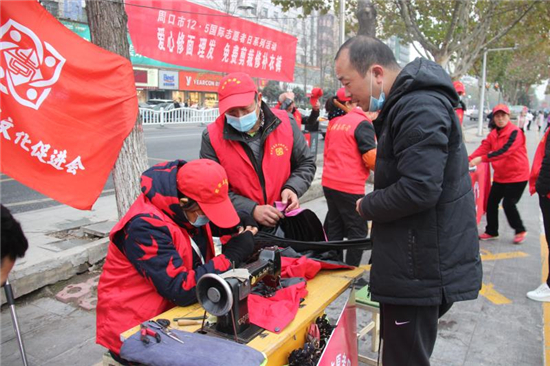 12月6日下午,周口市慈孝文化促進會、周口環(huán)境保護協(xié)會的志愿者來到周口中心城區(qū)五一文化廣場開展以愛心剪發(fā)、免費剪裁、修補衣褲為主要內(nèi)容的便民志愿服務(wù)活動。