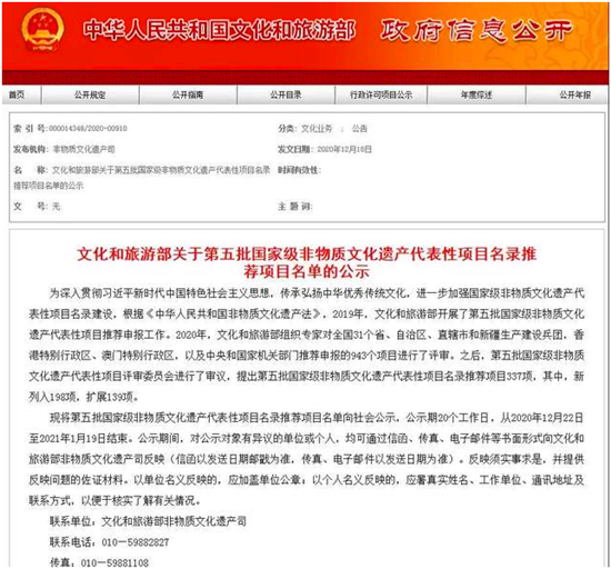 據(jù)了解,2019年,文化和旅游部開(kāi)展了第五批國(guó)家級(jí)非物質(zhì)文化遺產(chǎn)代表性項(xiàng)目推薦申報(bào)工作。2020年,文化和旅游部組織專家對(duì)全國(guó)31個(gè)省、自治區(qū)、直轄市和新疆生產(chǎn)建設(shè)兵團(tuán),香港特別行政區(qū)、澳門特別行政區(qū),以及中央和國(guó)家機(jī)關(guān)部門推薦申報(bào)的943個(gè)項(xiàng)目進(jìn)行了評(píng)審。之后,第五批國(guó)家級(jí)非物質(zhì)文化遺產(chǎn)代表性項(xiàng)目評(píng)審委員會(huì)進(jìn)行了審議,提出第五批國(guó)家級(jí)非物質(zhì)文化遺產(chǎn)代表性項(xiàng)目名錄推薦項(xiàng)目337項(xiàng),其中,新列入198項(xiàng),擴(kuò)展139項(xiàng)。