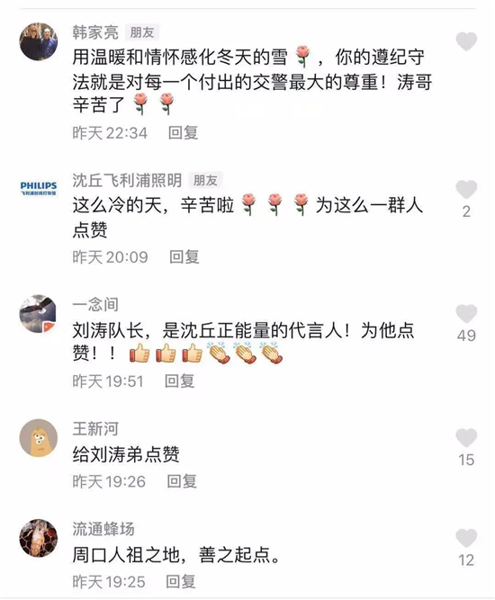 2021年元旦,記者聯(lián)系聯(lián)系上了視頻中的主人公——沈丘縣交警大隊(duì)城市中隊(duì)劉濤中隊(duì)長(zhǎng),雖然是元旦假日,他依然堅(jiān)守在崗位上,他告訴記者,這是一名交警工作的日常,沒(méi)有想到自己和同事們的一個(gè)小舉動(dòng)能獲得無(wú)數(shù)網(wǎng)友好評(píng),這給了他們?cè)谝院蠊ぷ髦懈蟮膭?dòng)力,劉濤表示,風(fēng)雪無(wú)阻,滾滾車流中,他將為全縣人民的安全出行繼續(xù)堅(jiān)守崗位。