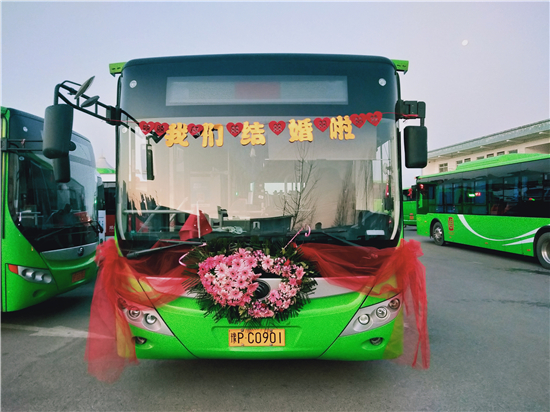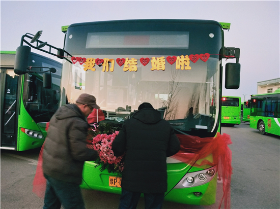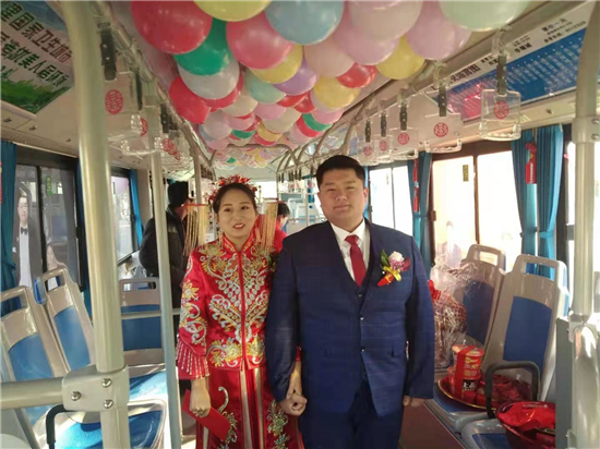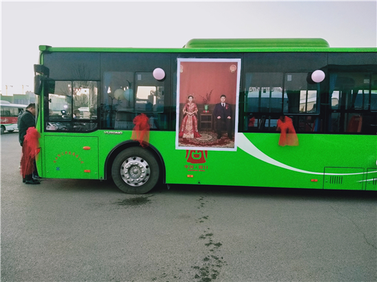 “這個(gè)想法是我和我媳婦一起商量出來的。我們覺得別人結(jié)婚都是用婚車,有點(diǎn)千篇一律。我們作為公交人就想另辟蹊徑,用我們公司的公交車當(dāng)婚車,同時(shí)也倡導(dǎo)綠色出行,還很有紀(jì)念意義。” 新郎買亞飛告訴記者。