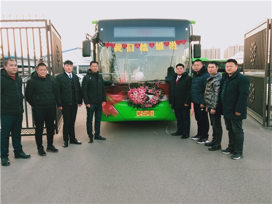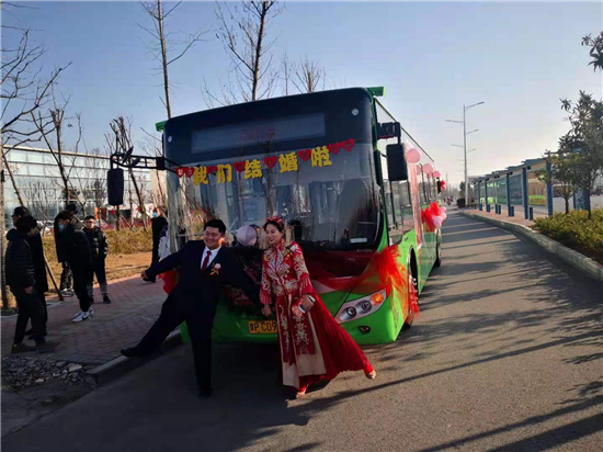 1月1日早上,裝飾一新的6輛迎親公交車吸引了眾人的目光。周口公交一公司19路公交車司機(jī)、新郎買亞飛用公交車,迎娶同為公交車司機(jī)的新娘裴丹陽,被當(dāng)作婚車的公交車為新能源車,正是新郎和新娘平時(shí)駕駛的19路和9路公交車,以及15路公交車。整個(gè)婚禮,親朋好友都是乘坐公交車趕往婚禮現(xiàn)場(chǎng),環(huán)保又有新意。