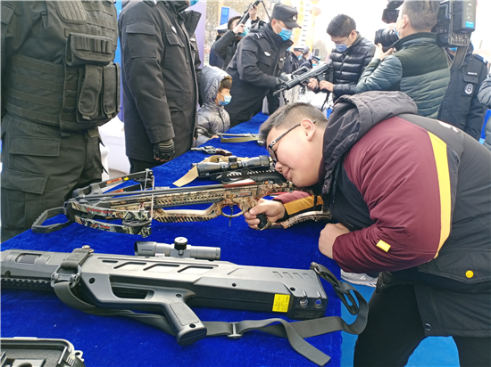 活動現(xiàn)場設(shè)置了“反假幣主題區(qū)”“消防主題區(qū)”“防電詐主題區(qū)”“禁毒主題區(qū)”“互動區(qū)”等形式多樣的功能展示區(qū),現(xiàn)場接受群眾咨詢,與市民深度互動,讓市民近距離體驗、全面感受人民警察的日常工作。除此之外,民警還進行了槍械展示、無人機展示等內(nèi)容。