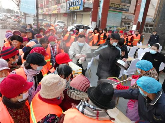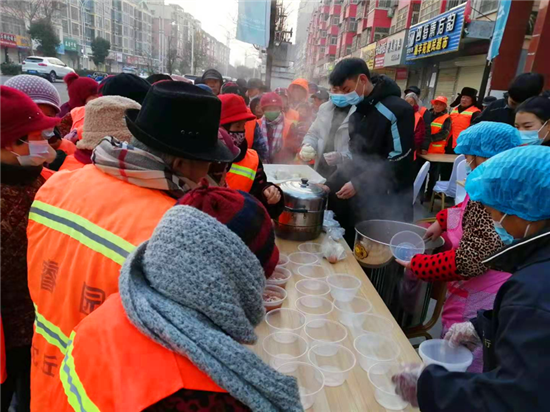“小孩小孩你別饞,過了臘八就是年?!迸D八節(jié)一大早,沈丘縣一小區(qū)門前熬制的臘八粥香味撲鼻,一碗碗熱氣騰騰的粥免費送給附近的居民、環(huán)衛(wèi)工人、公安民警和快遞小哥品嘗,大家一起共話臘八情。