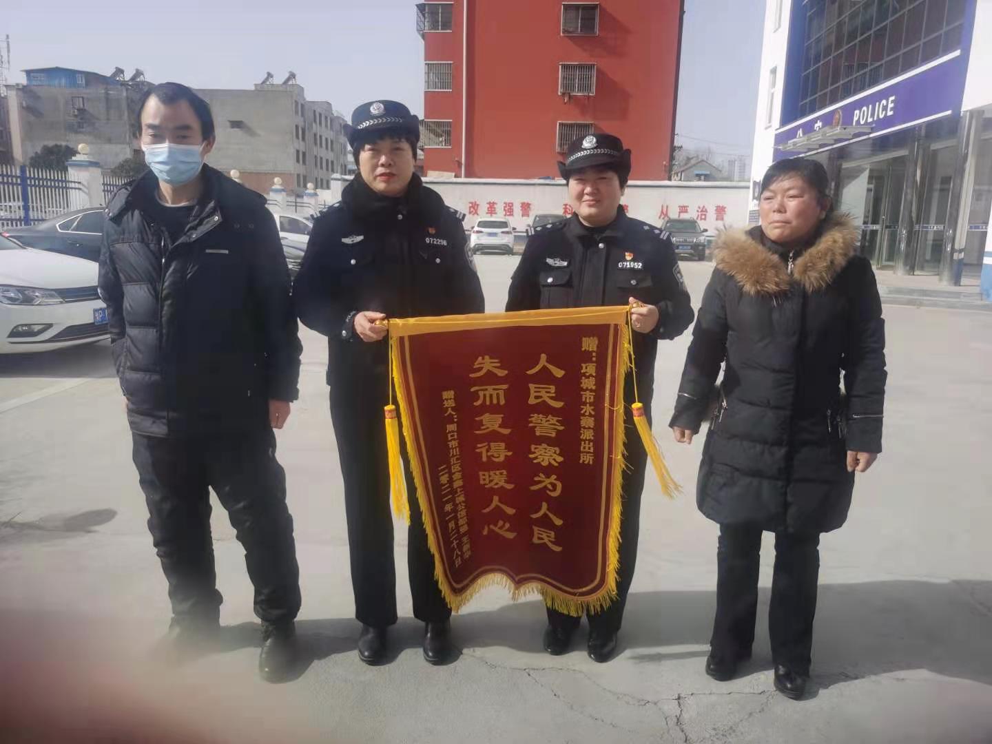 1月28日上午,鄒某夫婦手持一面 “人民警察為人民 失而復(fù)得暖人心”的錦旗,來到項(xiàng)城市公安局水寨派出所,向所長韓莉等民警表示感謝。