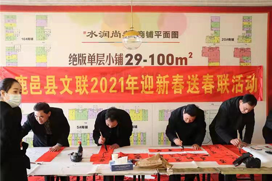 “我是做生意的,能幫我寫一幅跟生意有關(guān)的春聯(lián)嗎?”2月7日,寒風(fēng)凜冽,鹿邑縣水潤(rùn)尚都、水潤(rùn)上苑兩個(gè)樓盤售樓處大廳卻春意融融。鹿邑縣文聯(lián)、縣書法家協(xié)會(huì)十余人走進(jìn)社區(qū)揮毫潑墨為業(yè)主送上濃濃的新春祝福。