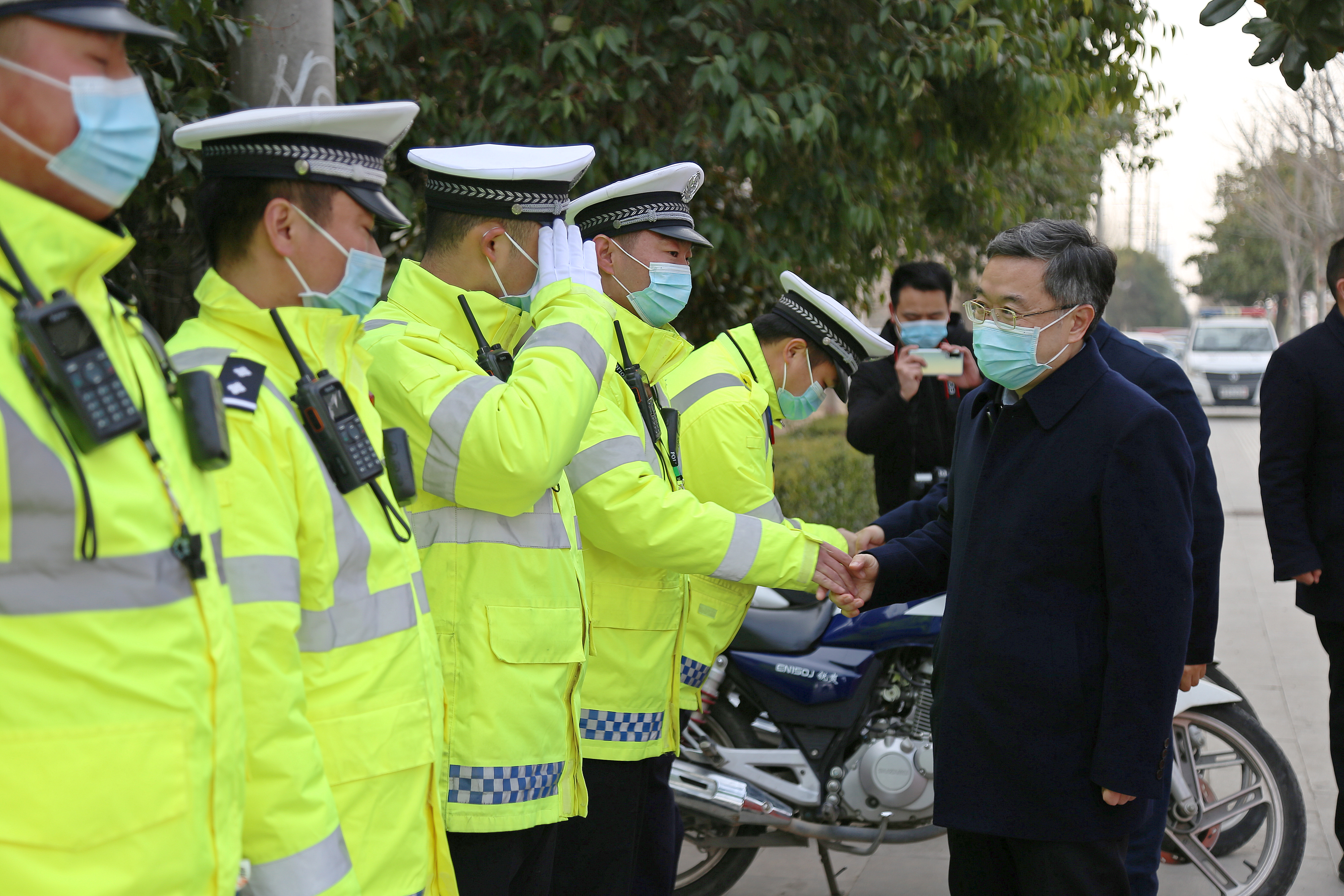 在縣交警大隊城區(qū)新區(qū)中隊五岔路口執(zhí)勤點,皇甫立新、劉國慶同正在執(zhí)勤的交通民警一一握手,并代表縣四個班子向交警大隊全體民警、協(xié)警一年來付出的努力和辛苦表示感謝和問候,囑咐他們要注意安全,保重身體。在詳細聽取春節(jié)期間治堵保暢工作情況匯報后,皇甫立新對交警大隊全體民警和輔警在春節(jié)期間舍小家為大家,始終堅守崗位保暢通的工作態(tài)度,以及無私奉獻、任勞任怨的工作作風給予高度評價。并希望大家在春節(jié)期間,繼續(xù)發(fā)揚吃苦耐勞的精神,科學做好道路安全保障工作,克服車多人多等困難,確保春節(jié)期間全縣道路交通安全暢通,讓全縣人民愉快度過一個平安、祥和的春節(jié)。同時要求縣交警大隊要進一步做好執(zhí)勤民警后勤保障及防寒保暖工作,加強人員輪換上崗,切實保障公安交警切身利益,解決他們的后顧之憂。