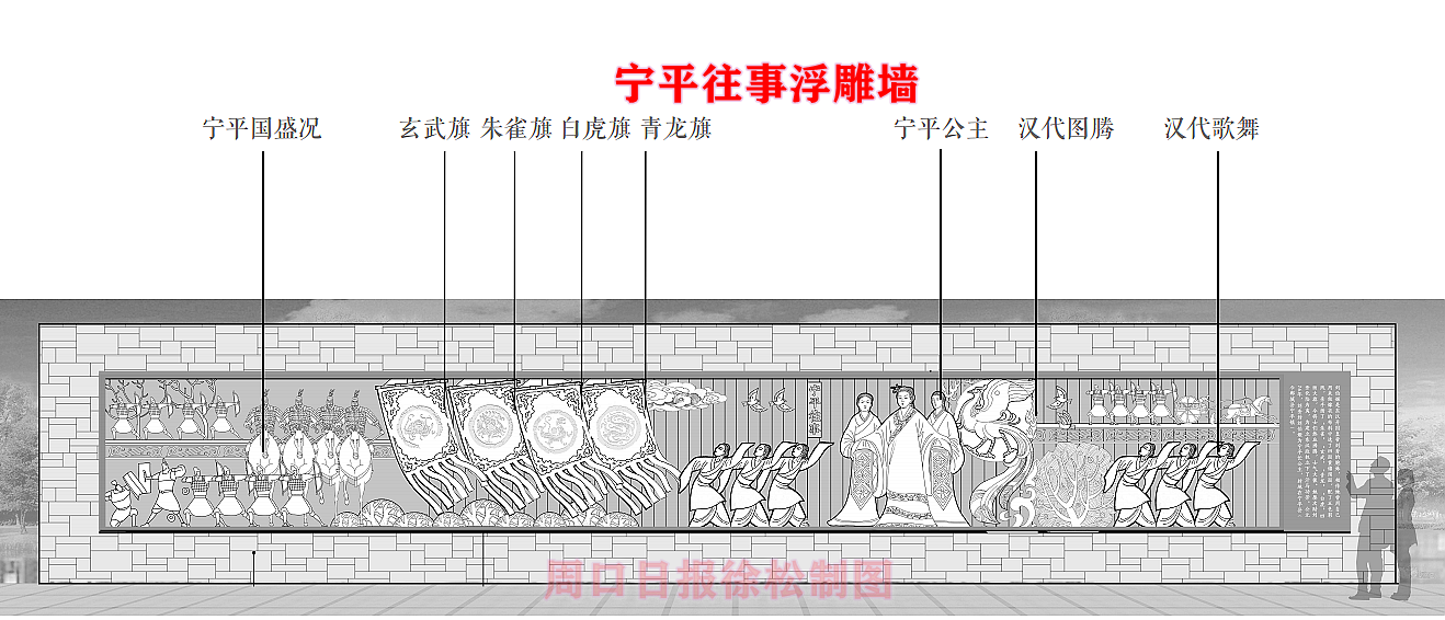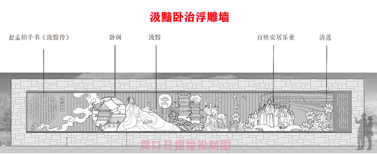 在縣委、縣政府綜合大樓東側(cè)的核心形象段,配合鄲城行政中心打造莊嚴(yán)、大氣氛圍的同時,對鄲城歷史文化進(jìn)行了集中展示,包括鄲城的歷史沿革,鄲城的發(fā)展理念,歷史故事等。其中調(diào)水渠西側(cè)以現(xiàn)有人民廣場對應(yīng)的綠地為基礎(chǔ),設(shè)置了較多的歷史文化節(jié)點。如調(diào)水渠新華路橋頭北側(cè)的廉政文化廣場,講述了漢朝名臣汲黯的故事。汲黯為人耿直,直諫廷諍,親政愛民,敢于承擔(dān)責(zé)任,漢武帝劉徹稱其為“社稷之臣”。汲黯廉政廣場建設(shè)在此處更有著深遠(yuǎn)的意義,它一方面提醒老百姓要了解歷史、敬畏先賢,同時也激勵著鄲城縣的各級黨員干部要在習(xí)近平新時代中國特色社會主義思想引領(lǐng)下,“不忘初心、牢記使命、廉潔奉公、一心為民”。