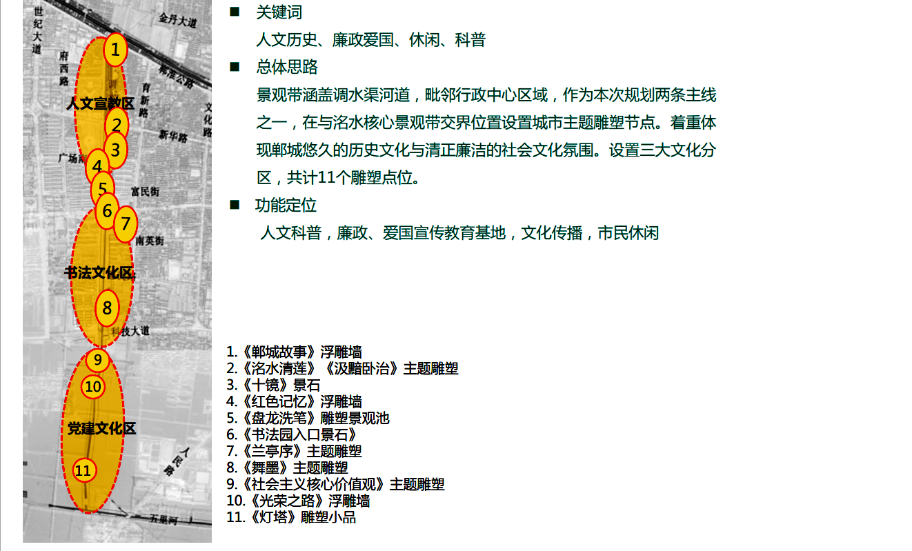 調(diào)水渠景觀在洺河生態(tài)水系“五帶五園一環(huán)多點”景觀中被稱為“人文歷史帶”。全程以“水脈、文脈、人脈”為核心,以“綠色、生態(tài)、休閑、文化”為理念,建設(shè)了“三段銜一園”的景觀結(jié)構(gòu),有鄲淮路至廣場南路的景觀核心形象段、廣場南路以南至科技大道的書法體驗段、科技大道以南至五里河的教育文化段和位于交通路與英博路之間的書法生態(tài)休閑園。全段景觀以人文歷史為主題,分別設(shè)置了文化廣場、汲黯廣場、廉政廣場、書林步道、墨香廣場、歷史長廊、書法公園等19處景觀節(jié)點。