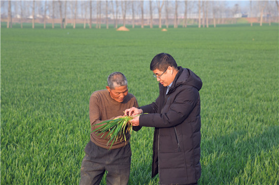 3月3日,商水縣黃寨鎮(zhèn)農(nóng)技人員在察看小麥長(zhǎng)勢(shì)。近日,我市普降小到中雨,旱情解除,土壤墑情改善,有利于冬小麥起身返青,為農(nóng)業(yè)豐收打下基礎(chǔ)。周口日?qǐng)?bào)·周道客戶端記者 付永奇 攝