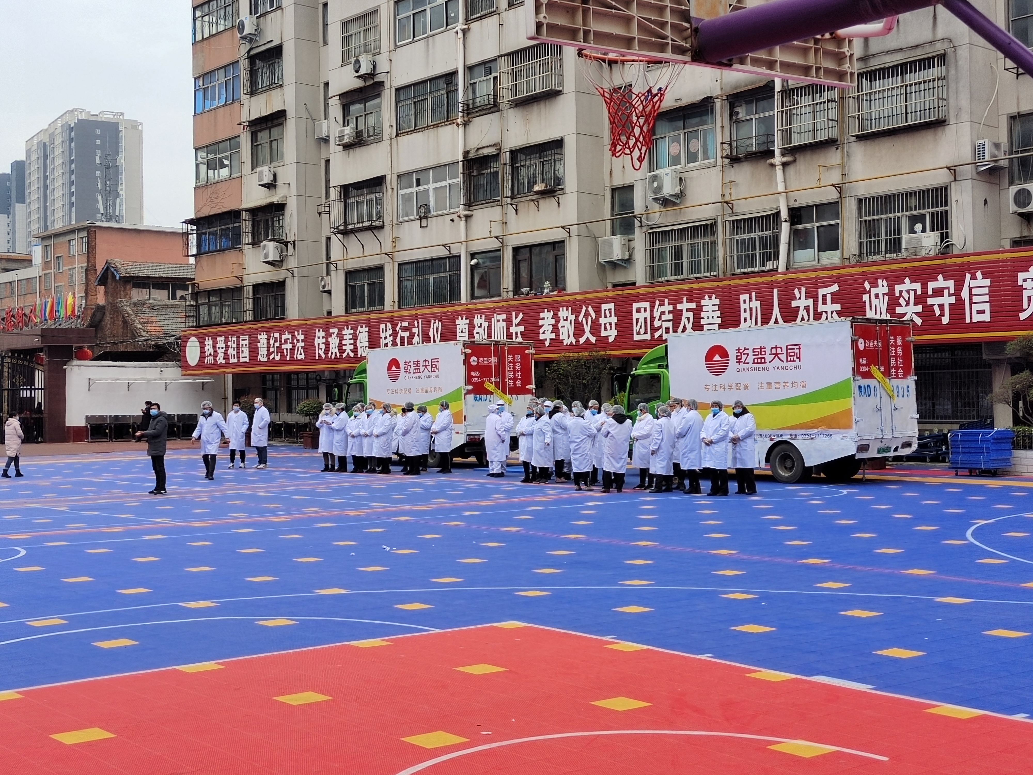 11時(shí)許,13000余份熱騰騰的飯菜即將送到周口市中心城區(qū)中小學(xué)生手中,直播團(tuán)隊(duì)對(duì)七一路二小的配送情況進(jìn)行現(xiàn)場(chǎng)直播。兩輛運(yùn)餐大卡車,20余名工作人員整裝待發(fā),乾盛央廚鄭州總公司的營(yíng)銷部負(fù)責(zé)人現(xiàn)場(chǎng)指揮調(diào)度七一路二小的發(fā)餐工作。揭掉卡車上的封條,留樣,測(cè)溫,裝車,按班分送,分發(fā)不銹鋼餐具,“哇!獅子頭!!”在孩子們的驚呼聲中,兩葷一素,一份米一份湯,熱氣騰騰地盛到孩子手中的餐具中。“孩子們吃不吃的飽呀?”面對(duì)各直播平臺(tái)上網(wǎng)友的提問,乾盛央廚鄭州總公司營(yíng)銷部負(fù)責(zé)人回答:“我們提前有準(zhǔn)備,飯、菜我們都免費(fèi)加,保證孩子們都吃飽,請(qǐng)家長(zhǎng)朋友們放心?!?/p>