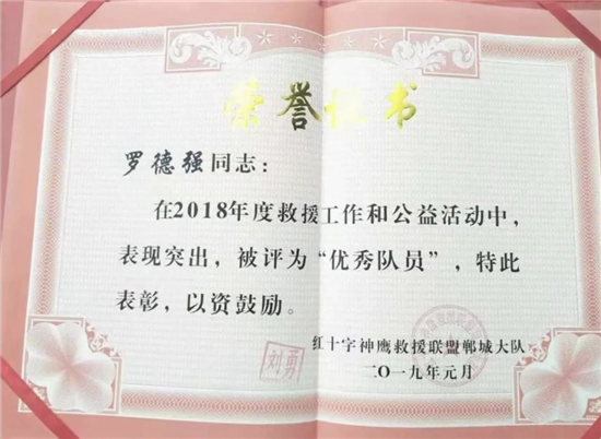 鄲城縣神鷹救援隊隊長劉勇說,正是看到了羅德強(qiáng)的優(yōu)秀品質(zhì),2018年將羅德強(qiáng)吸納為神鷹救援隊員?!吧聱椌仍?lián)盟鄲城大隊隸屬于中國神鷹救援隊,由各個行業(yè)的志愿者組成,也是河南省成立最早的一支民間救援隊,除參加全國各地災(zāi)后救援活動外,日常積極參加社會志愿者活動。”“我一個人的力量很有限,加入這個優(yōu)秀集體,能夠?qū)W到更多專業(yè)救援知識,從而幫助更多的人,我感到非常驕傲和自豪?!绷_德強(qiáng)說。2019年8月10日,受第九號臺風(fēng)“利奇馬”影響,山東省壽光市、東營市等部分地區(qū)遭受洪災(zāi)。8月11日晚上,紅十字神鷹救援聯(lián)盟鄲城大隊趕赴山東壽光救災(zāi)。面對洪災(zāi),羅德強(qiáng)和其他救援隊員不畏辛苦,劃船深入各個受災(zāi)鄉(xiāng)村救助被困群眾。壽光市一鄉(xiāng)鎮(zhèn)3處大閘因斷電出現(xiàn)險情,需要人力進(jìn)行開閘泄洪。羅德強(qiáng)和隊員冒險攀爬到大閘上進(jìn)行人工作業(yè),經(jīng)過3個多小時的奮戰(zhàn),3處大閘全部打開,安全泄洪。2019年9月1日,參加泳渡日月潭返程途中,羅德強(qiáng)在福建高速公路上,發(fā)現(xiàn)前方車輛發(fā)生車禍,一名司機(jī)腿部骨折、血流不止。他立即下車和司機(jī)溝通,一邊報警,一邊利用專業(yè)救援知識打開變形的車門,順利將司機(jī)救出?!坝捎谶^度驚嚇,司機(jī)以骨折為由拒絕下車。當(dāng)我告訴司機(jī)自己是神鷹救援隊員、救援技術(shù)過硬后,才同意我們施救?!碑?dāng)時高速上車流密集,情況十分危險,如果司機(jī)不能及時救出,后果不堪設(shè)想?!拔覀冘囕v加油、住宿、吃飯等救援費(fèi)用都是隊員AA制負(fù)擔(dān),從來不給當(dāng)?shù)卣蚓戎颂砣魏温闊?。?/p>