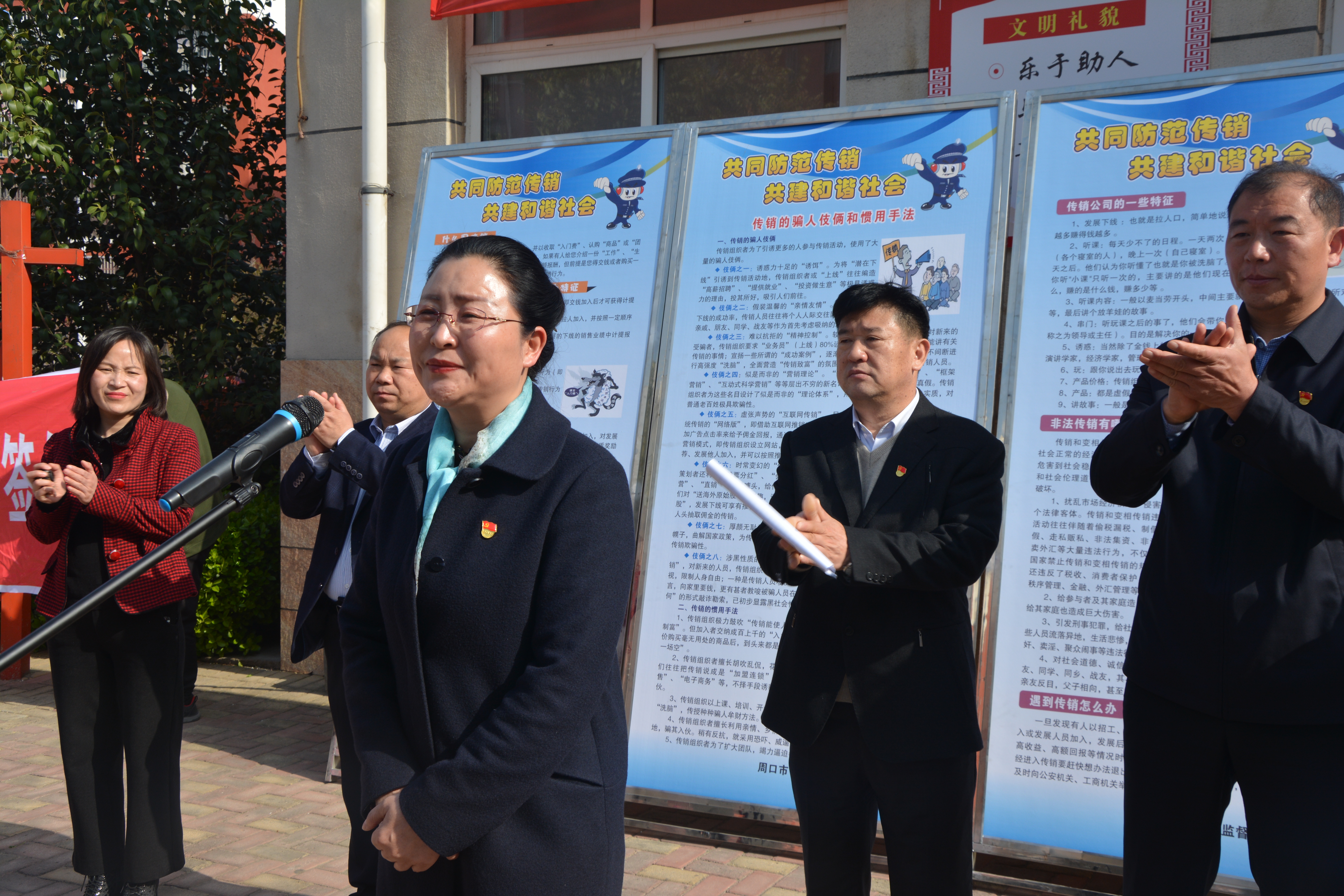市市場(chǎng)監(jiān)管局二級(jí)高級(jí)主辦王樹平,港區(qū)打擊傳銷工作領(lǐng)導(dǎo)小組組長、黨委委員、紀(jì)委書記李素芹出席活動(dòng),市市場(chǎng)監(jiān)管局公平交易科科長豐亞偉、主任科員孟金鳳,港區(qū)管委會(huì)維穩(wěn)創(chuàng)新辦、安全辦、李埠口鄉(xiāng)政府負(fù)責(zé)人,周口市公安局港區(qū)分局民警輔警代表、各行政村分管同志、三個(gè)小區(qū)物業(yè)公司代表,市場(chǎng)監(jiān)管局港區(qū)分局全體同志,周口日?qǐng)?bào)社等新聞單位以及前來參觀的群眾參加了活動(dòng)。港區(qū)打擊傳銷工作領(lǐng)導(dǎo)小組辦公室主任、市場(chǎng)監(jiān)管局港區(qū)分局局長崔健作創(chuàng)建動(dòng)員講話。他指出,嚴(yán)厲打擊傳銷違法行為,增強(qiáng)廣大群眾識(shí)別傳銷、抵制傳銷的能力,發(fā)動(dòng)社會(huì)力量群防群控,是加強(qiáng)平安建設(shè),打造平安港區(qū),進(jìn)一步促進(jìn)社會(huì)和諧穩(wěn)定的重要舉措。開展無傳銷社區(qū)村創(chuàng)建活動(dòng),就是動(dòng)員全社會(huì)特別是基層派出所、市場(chǎng)監(jiān)管所、社區(qū)(村)等力量,展開群防群控,重點(diǎn)加強(qiáng)對(duì)流動(dòng)人口密集、情況復(fù)雜區(qū)域的檢查力度,形成縱橫交錯(cuò)、內(nèi)外結(jié)合、上下聯(lián)動(dòng)的網(wǎng)格體系,全力擠壓傳銷活動(dòng)生存空間,始終保持對(duì)傳銷的高壓態(tài)勢(shì),增強(qiáng)群眾抵制傳銷的自覺性和積極性,鏟除傳銷滋生的土壤,推進(jìn)打擊傳銷工作再上新臺(tái)階。