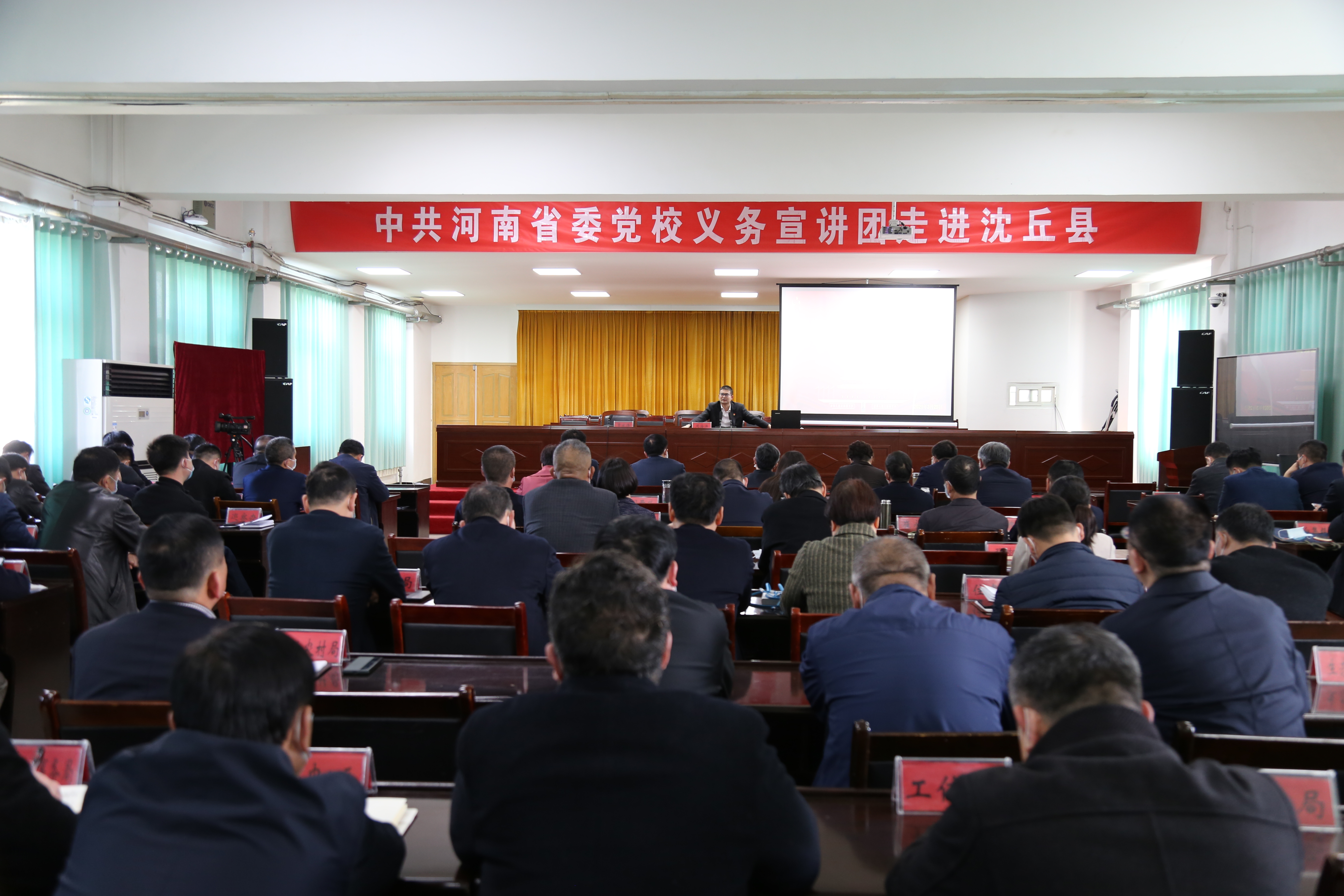 3月25日下午,中共河南省委黨校義務(wù)宣講團(tuán)走進(jìn)沈丘縣開展宣講活動(dòng)?;矢α⑿?、賈慶偉、殷曉春、趙振、郝四春、劉和輝、呂孝坤等在家的縣四個(gè)班子領(lǐng)導(dǎo)及副處級以上干部與全縣近200余名黨員干部共同聆聽了宣講報(bào)告??h委副書記賈慶偉主持報(bào)告會。