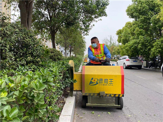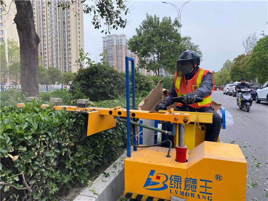 4月13日,周口大道上園林工人操作著特殊的園林作業(yè)車,修剪路邊的綠化樹,使用“電推子”,不僅提高了效率、節(jié)省了人力,就連“剃”出來(lái)的“平頭”也更平了?!半娡谱印彼街?,綠化樹被修剪得很齊整。②9