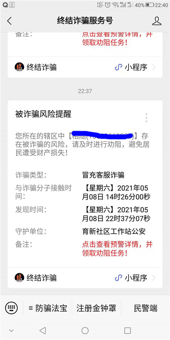 5月8日,鄲城縣公安局南關(guān)派出所社區(qū)民警收到“金鐘罩”推送的反詐預(yù)警信息,轄區(qū)居民郭某有受騙風(fēng)險,社區(qū)民警第一時間聯(lián)系郭某核實(shí)了解相關(guān)情況并及時予以制止。
