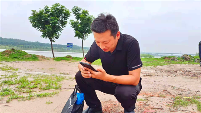 張志新在賈魯河西華城區(qū)段采訪汛情后現(xiàn)場寫稿
