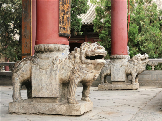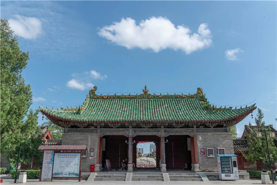 整個古建筑群為仿宮殿式,山門、鐵旗桿、石牌坊、碑亭、饗殿、大殿、河伯殿、炎帝殿、戲樓、拜殿、春秋閣由南向北,建于中軸線上,藥王殿、灶君殿和東廊房,財神殿、酒仙殿及西廊房在前院左右,東西看樓、東西配殿建在中院兩側(cè),老君殿、馬王殿、瘟神殿為東偏房,客房僧舍位于西院。是全國重點文物保護單位,國家AAAA級旅游景區(qū),國家三級博物館。