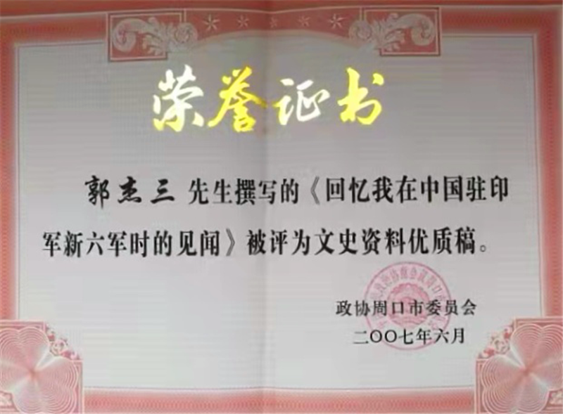 2005年9月3日,時(shí)任中共中央總書記、國家主席、中央軍委主席胡錦濤發(fā)表了《在紀(jì)念中國人民抗日戰(zhàn)爭暨世界反法西斯戰(zhàn)爭勝利60周年大會上的講話》,正視了正面戰(zhàn)場國民黨軍隊(duì)抗戰(zhàn)的歷史。之后,父親才給我講述他遠(yuǎn)征抗日的經(jīng)歷,并撰寫了《回憶我在中國駐印軍新六軍時(shí)的見聞》一稿,刊登在2007年《周口文史資料》上。政協(xié)為表彰父親的貢獻(xiàn),特別頒發(fā)了“文史資料優(yōu)質(zhì)稿”獎(jiǎng)狀。