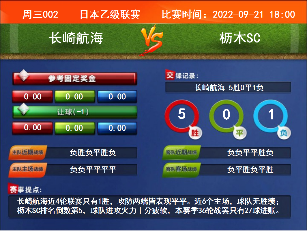 比賽時(shí)間:2022-09-21 18:00賽事提點(diǎn):長(zhǎng)崎航海近4輪聯(lián)賽只有1勝,攻防兩端皆表現(xiàn)平平。近6個(gè)主場(chǎng),球隊(duì)無(wú)勝績(jī);櫪木SC排名倒數(shù)第5,球隊(duì)進(jìn)攻火力十分疲軟,本賽季36輪戰(zhàn)罷只有27球進(jìn)賬。