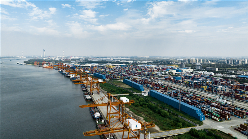 碧藍(lán)晴空,江風(fēng)悠悠。長(zhǎng)江江面上,一艘艘集裝箱班輪陸續(xù)抵達(dá)龍?zhí)陡蹍^(qū),碼頭邊的岸橋一直在忙碌著將集裝箱吊裝上岸,五顏六色的集裝箱被如同搭積木一樣整齊堆放。