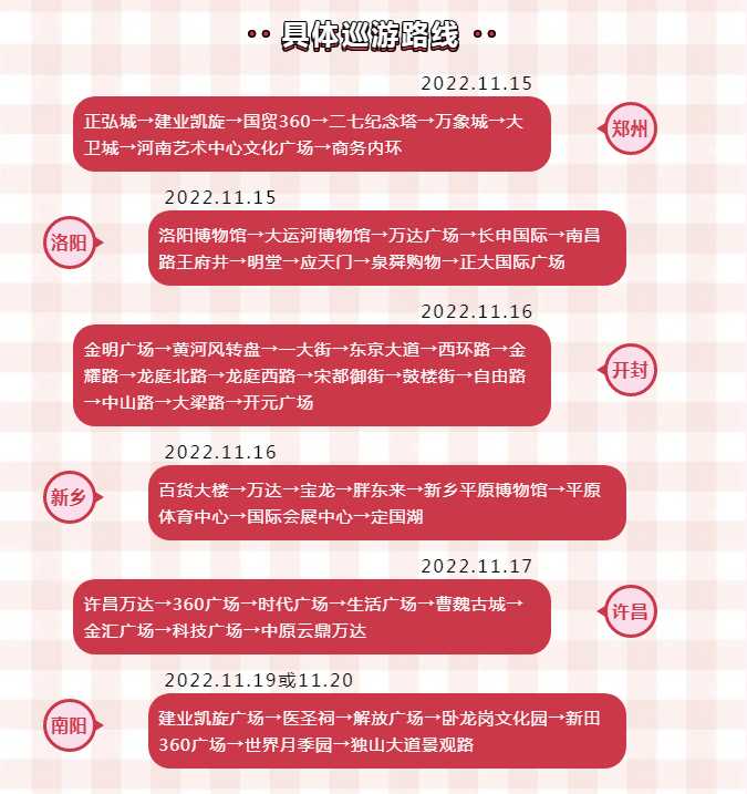 巡游活動(dòng)將會(huì)陸續(xù)在開封、洛陽、新鄉(xiāng)、許昌、南陽五市展開,途經(jīng)各個(gè)地市商圈及市中心地帶,馬上參考我們下方的路線,追著我們的車隊(duì)一起跑起來吧!