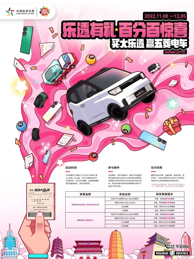 巡游期間,河南體彩大樂透的購彩抽獎(jiǎng)活動(dòng)也將同步開啟,大樂透第22128期(11月7日20:10開售)-第22139期,共12期,期期均有大禮派送,頭獎(jiǎng)可獲得五菱mini GameBoy玩咖版一輛!