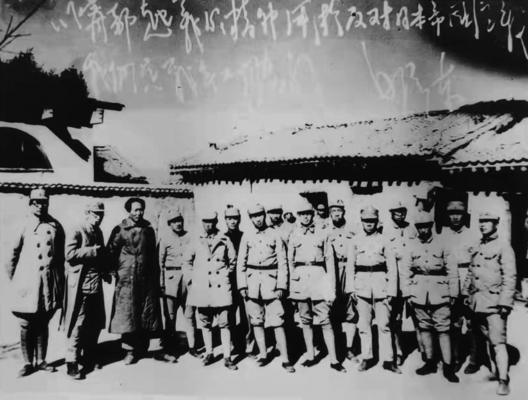 1938年12月,毛澤東(左三)、王稼祥(左二)、蕭勁光(左一)等與參加寧都起義的部分同志在陜北合影。左八為于朝俊。