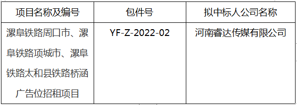 漯阜鐵路周口市、漯阜鐵路項城市、漯阜鐵路太和縣鐵路橋涵廣告位招租項目評標結果公示