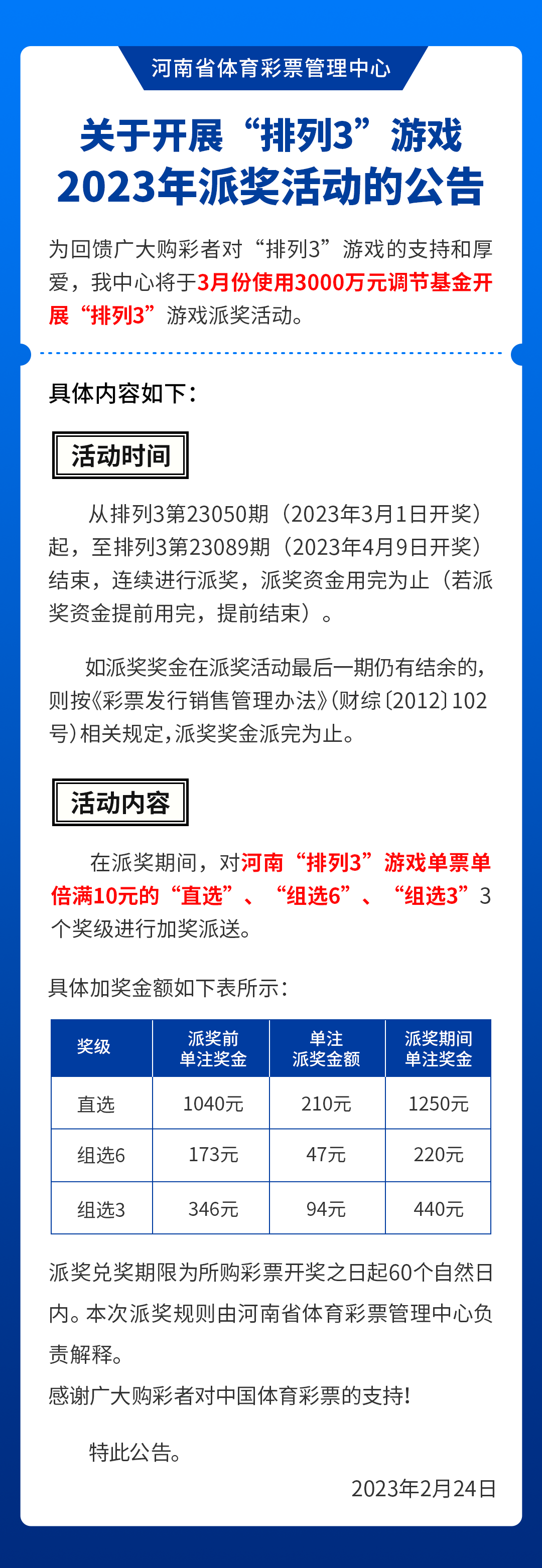 “排列3”游戲2023年派獎活動公告