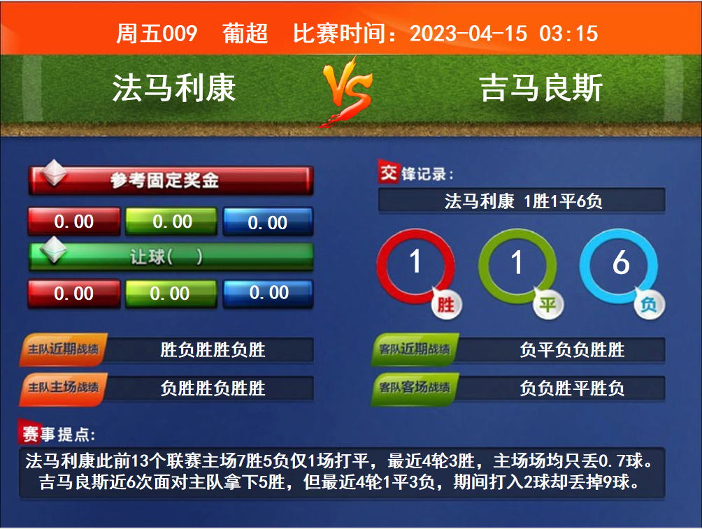 比賽時(shí)間:2023-04-15 03:15賽事提點(diǎn):法馬利康此前13個(gè)聯(lián)賽主場7勝5負(fù)僅1場打平,最近4輪3勝,主場場均只丟0.7球。吉馬良斯近6次面對主隊(duì)拿下5勝,但最近4輪1平3負(fù),期間打入2球卻丟掉9球。