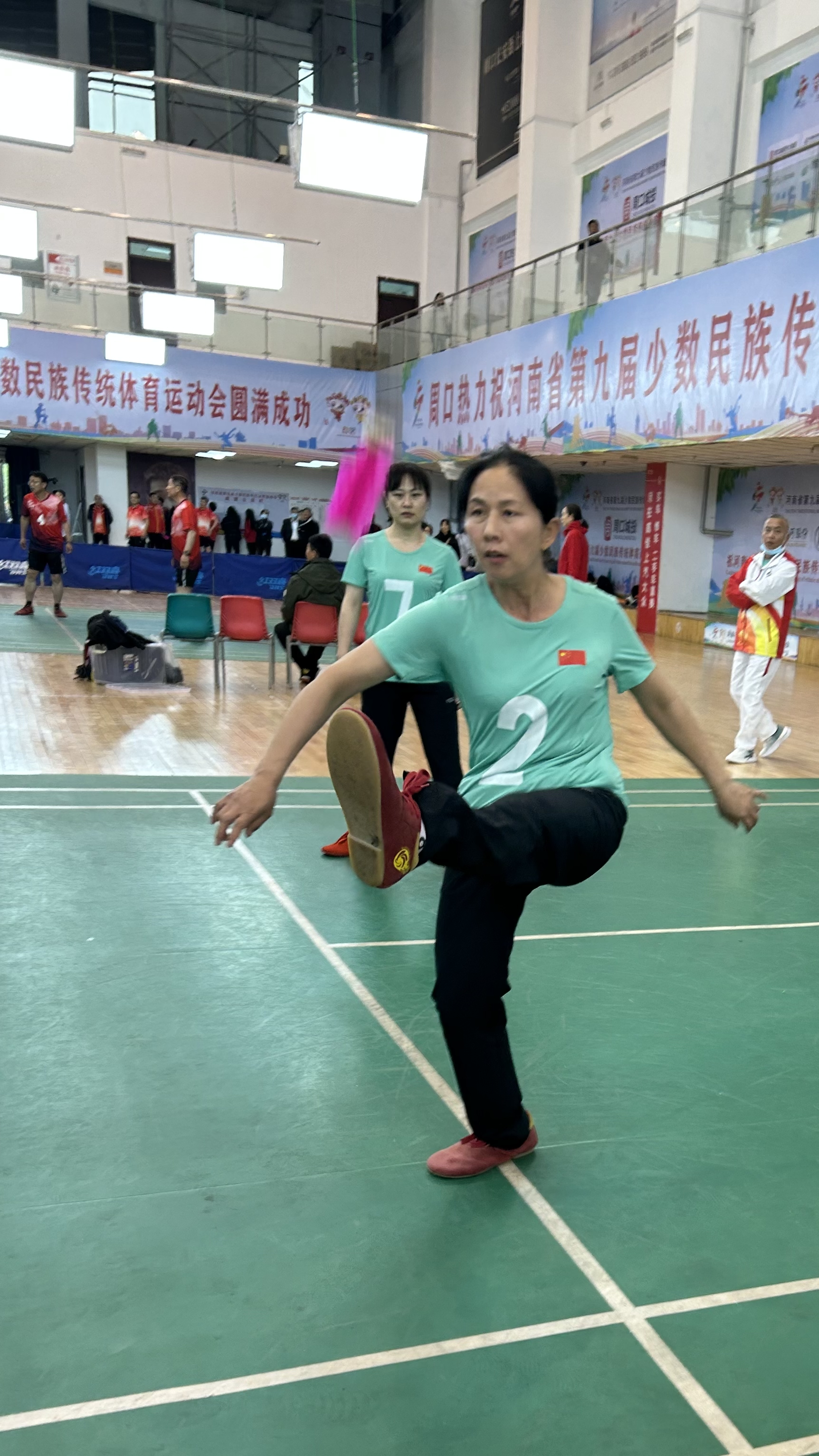 本次毽球競(jìng)賽共有7支隊(duì)伍、98名運(yùn)動(dòng)員參賽,設(shè)置有男子三人毽球、女子三人毽球,男子雙人毽球、女子雙人毽球等競(jìng)賽項(xiàng)目。場(chǎng)地分為4個(gè),為保證比賽公平性,每個(gè)場(chǎng)地均配備有6名裁判。男子三人毽球、女子三人毽球競(jìng)賽采用單循環(huán)賽制,按照最終累積分?jǐn)?shù)進(jìn)行排位;男子、女子雙人毽球競(jìng)賽則采取淘汰制,賽后將評(píng)比出一、二、三等獎(jiǎng)。作為東道主,周口派出12名隊(duì)員參加競(jìng)賽。