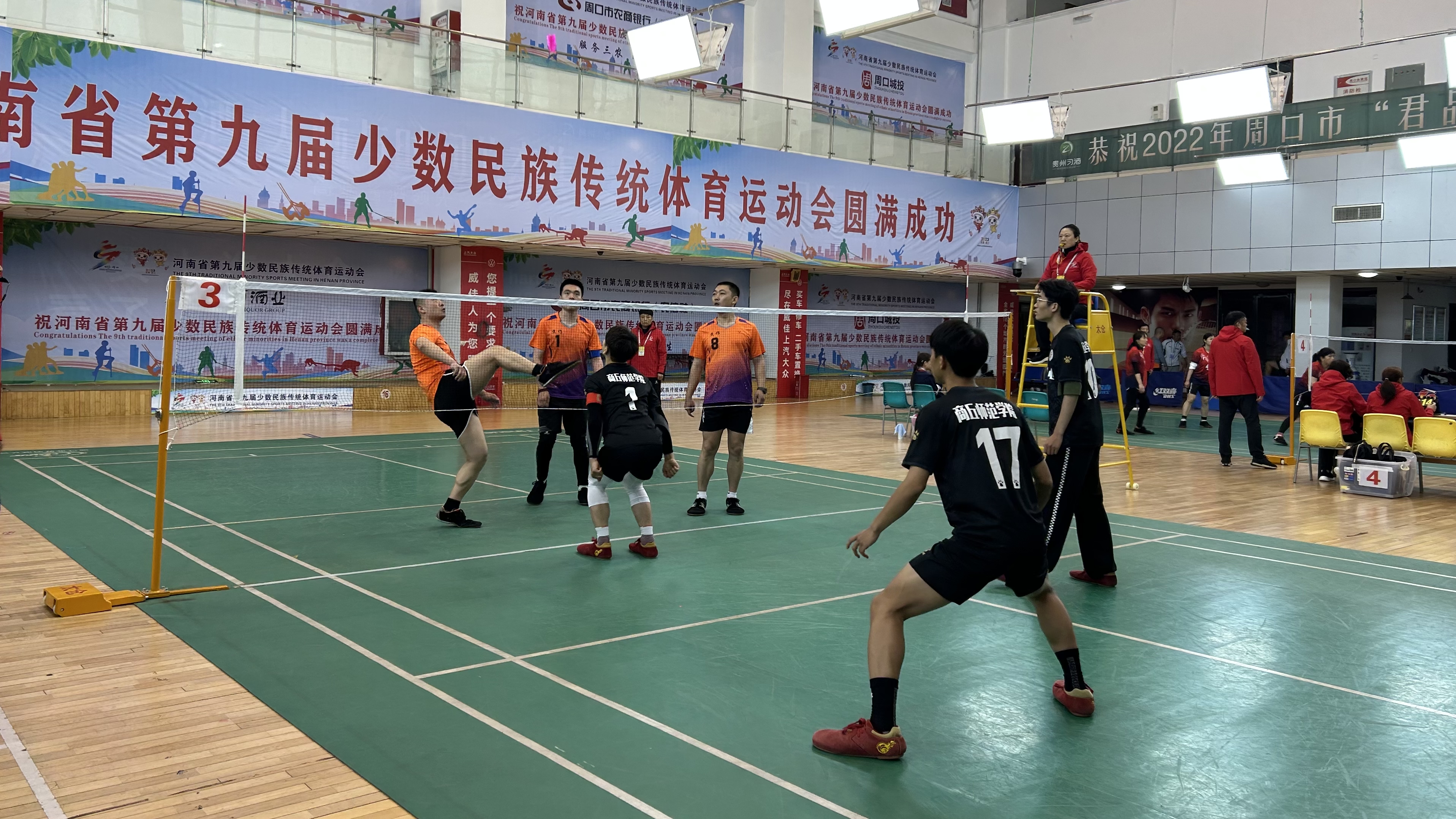 在首日頗具看點(diǎn)的男子三人毽(鄭州隊(duì)VS焦作隊(duì))競(jìng)賽中,作為“種子隊(duì)”,鄭州隊(duì)在接起對(duì)方發(fā)球后,利用“三人接發(fā)球”進(jìn)攻陣形,運(yùn)用強(qiáng)攻、快攻、兩次攻及多點(diǎn)攻等戰(zhàn)術(shù)打法,突破對(duì)方攔網(wǎng);焦作隊(duì)頂住壓力、不甘示弱,只見隊(duì)員們配合默契,將毽球用前胸輕松一頂、落至膝蓋,再用一記踩踏攻球,攻至對(duì)方區(qū)域。雙方不斷拉鋸,最終,鄭州隊(duì)獲勝累積一分。值得一提的是,比賽過半時(shí),鄭州隊(duì)92號(hào)隊(duì)員在撲身攔網(wǎng)時(shí),因幅度較大失去重心,朝欄網(wǎng)壓去,一瞬間,距離最近的焦作隊(duì)7號(hào)隊(duì)員毫不猶豫沖上前扶住,雙方隊(duì)員紛紛上前關(guān)心查看。一時(shí)間,一股團(tuán)結(jié)、和諧、友愛之風(fēng)席卷整個(gè)比賽現(xiàn)場(chǎng)。