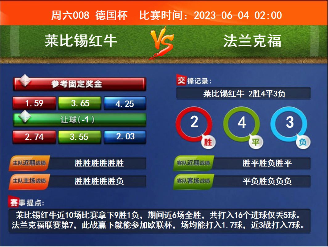 比賽時(shí)間:2023-06-04 02:00賽事提點(diǎn):萊比錫紅牛近10場(chǎng)比賽拿下9勝1負(fù),期間近6場(chǎng)全勝,共打入16個(gè)進(jìn)球僅丟5球。法蘭克福聯(lián)賽第7,此戰(zhàn)贏下就能參加歐聯(lián)杯,場(chǎng)均能打入1.7球,近3戰(zhàn)打入7球。