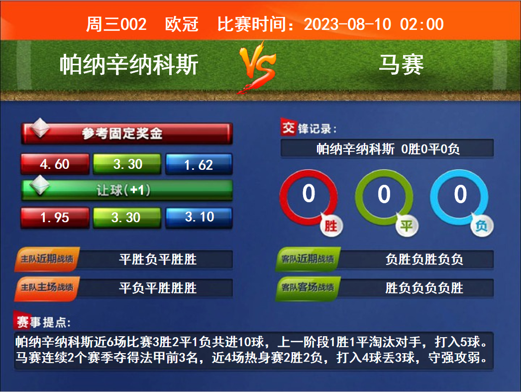 馬賽 比賽時(shí)間:2023-08-10 02:00賽事提點(diǎn):帕納辛納科斯近6場(chǎng)比賽3勝2平1負(fù)共進(jìn)10球,上一階段1勝1平淘汰對(duì)手,打入5球。馬賽連續(xù)2個(gè)賽季奪得法甲前3名,近4場(chǎng)熱身賽2勝2負(fù),打入4球丟3球,守強(qiáng)攻弱。