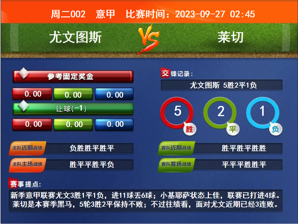 比賽時間:2023-09-27 02:45賽事提點:新季意甲聯(lián)賽尤文3勝1平1負(fù),進(jìn)11球丟6球;小基耶薩狀態(tài)上佳,聯(lián)賽已打進(jìn)4球。萊切是本賽季黑馬,5輪3勝2平保持不敗;不過往績看,面對尤文近期已經(jīng)3連敗。