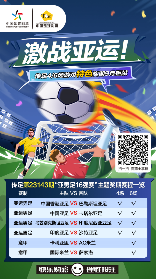杭州亞運(yùn)會(huì)男足16強(qiáng)出爐,傳足4/6場游戲第23143期競猜對(duì)象為4場亞運(yùn)男足1/8決賽賽事和2場意甲賽事,分別為中國香港亞足VS巴勒斯坦亞足、中國亞足VS卡塔爾亞足、烏茲別克斯坦亞足VS印度尼西亞亞足、印度亞足VS沙特亞足、卡利亞里VSAC米蘭和國際米蘭VS薩索洛。