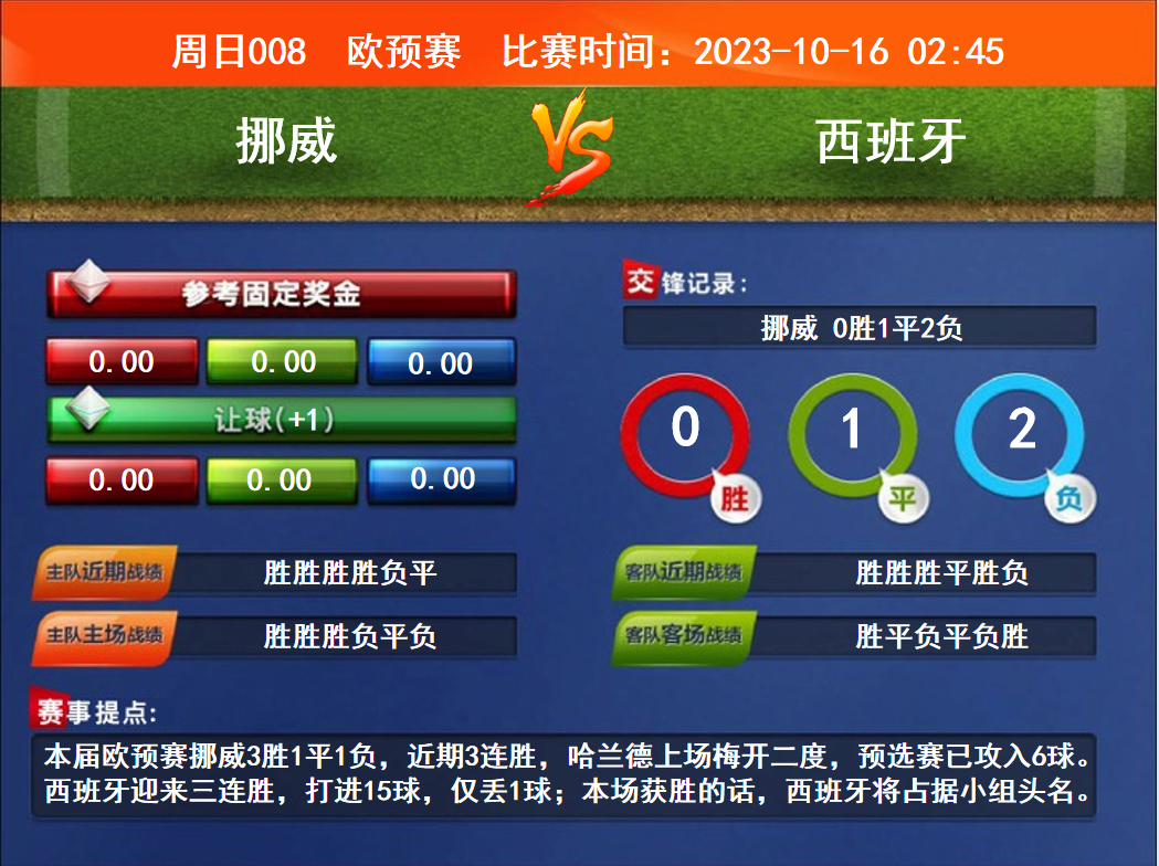 比賽時(shí)間:2023-10-16 02:45賽事提點(diǎn):本屆歐預(yù)賽挪威3勝1平1負(fù),近期3連勝,哈蘭德上場梅開二度,預(yù)選賽已攻入6球。西班牙迎來三連勝,打進(jìn)15球,僅丟1球;本場獲勝的話,西班牙將占據(jù)小組頭名。
