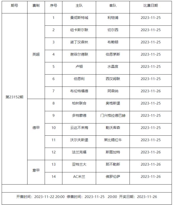 足球彩票勝負游戲(14場和任選9場)第23152期賽程: