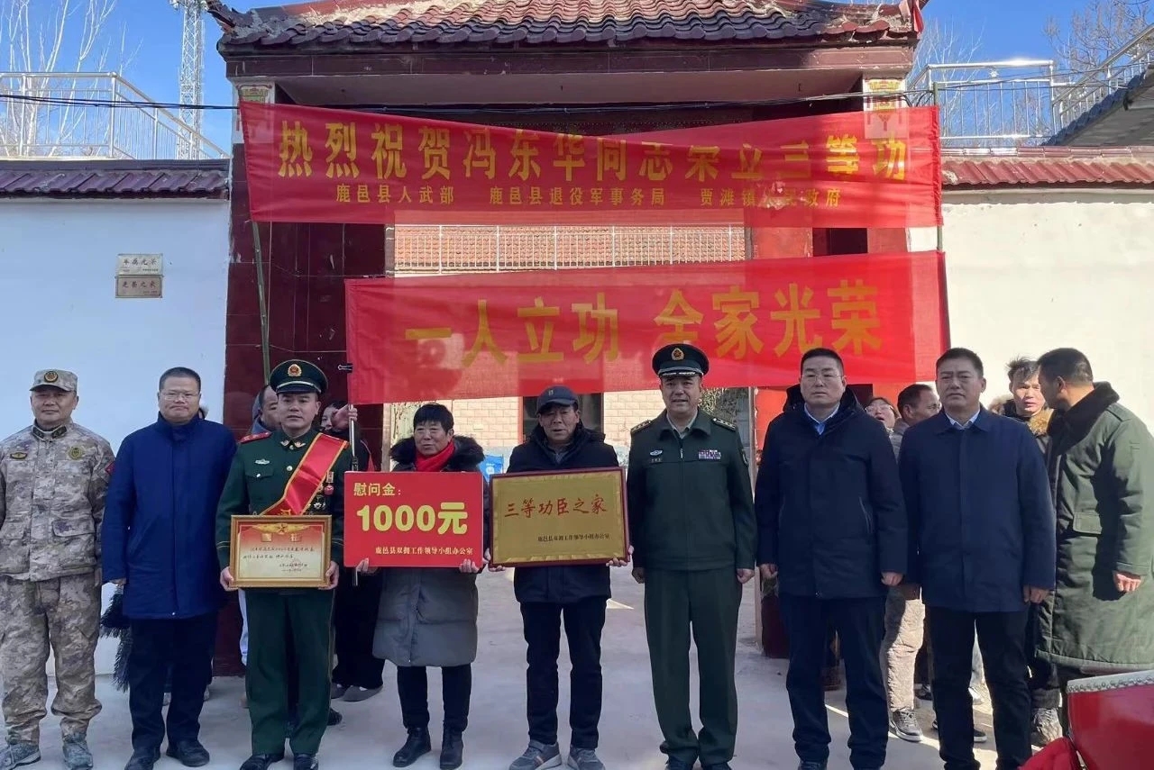 喜報(bào)傳佳音,榮耀滿門庭。為進(jìn)一步弘揚(yáng)新時(shí)代擁軍優(yōu)屬光榮傳統(tǒng),增強(qiáng)軍人榮譽(yù)感和軍屬自豪感,1月22日,鹿邑縣人武部領(lǐng)導(dǎo)帶領(lǐng)縣人武部、縣退役軍人事務(wù)局及賈灘鎮(zhèn)黨委政府相關(guān)負(fù)責(zé)同志及現(xiàn)役軍人所在部隊(duì)代表一行人,敲鑼打鼓來(lái)到榮立三等功的現(xiàn)役軍人馮東華同志家中,送上立功喜報(bào)和慰問(wèn)品,向立功軍人及家屬表達(dá)親切的關(guān)懷和衷心的祝賀。