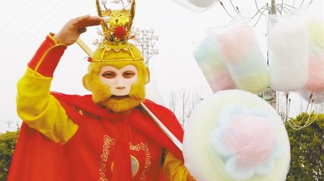 “媽媽快看,美猴王!”2月14日,在商水文化廣場,一名身著美猴王服飾的棉花糖攤主引得市民駐足觀看。記者也隨著人群來到了這個小攤前。聽聲音,記者感覺攤主年齡不大。走近一看,只見“美猴王”從一個個小盒子將各種顏色的白糖,舀進棉花糖機里,隨后緩緩地轉(zhuǎn)動長竹簽,不一會兒,一絲絲彩色的糖霜就纏繞在長竹簽上,經(jīng)過“美猴王”的巧手制作,一朵彩色的棉花糖“花”不一會兒就做好了。